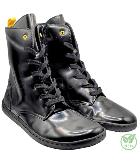 Bota minimalista de la marca de calzado respetuoso Coqueflex, bota negra estilo urbano con cordones. El tipo de cierre cordones y cremallera lateral interior asegurando un ajuste perfecto y siendo fácil de poner y quitar. De cuero sintético es ideal para quien busca un look moderno sin renunciar a la comodidad y libertad de movimiento. Bota militar estilizada.