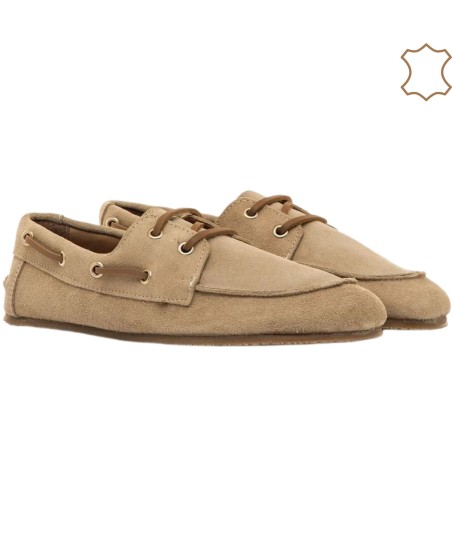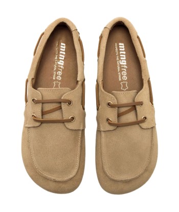 Zapato barefoot Mocasín tipo náutico, modelo Free Mia de Mustang diseñado en serraje suave de color beige. Los cordones a tono y los detalles laterales con ojales metálicos le dan un aire funcional sin perder estilo. Se trata de un calzado minimalista que gracias a su puntera ancha, suela totalmente plana (cero drop) y flexibilidad, mejora la anatomía del pie y favorece una mejor posición del mismo.