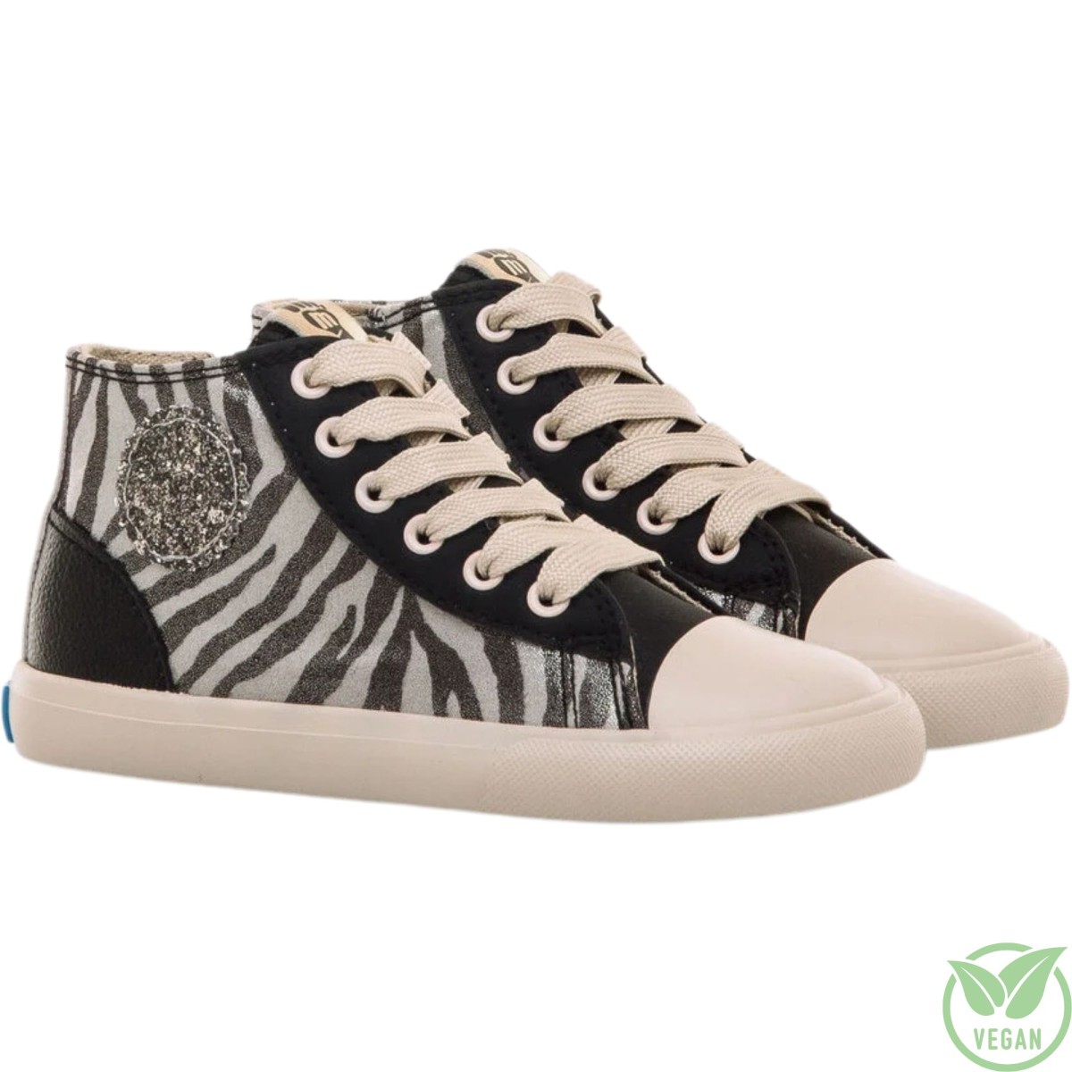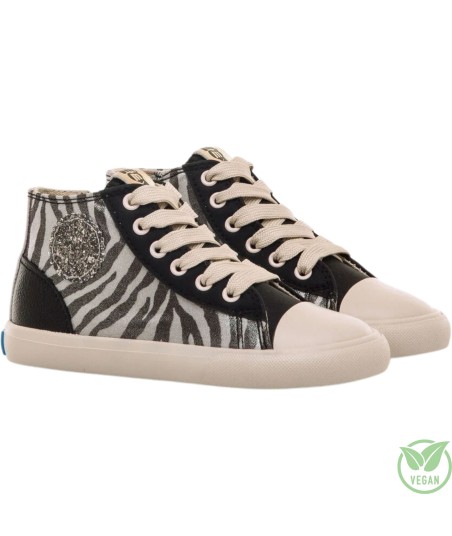 Zapatilla abotinada de color negro con estampado animal print de cebra, modelo Free de Mustang. Con un diseño de caña media que combina estilo y funcionalidad, incorpora cordones anchos en tono crudo y cremallera lateral para facilitar el calce, así como un distintivo parche lateral de glitter en tono plata. Con certificado VEGANO sellado por INESCOP, el cual garantiza que la naturaleza química principal del material no se corresponde con fibras de origen animal. Diseñado y desarrollado especialmente en colaboración con el Dr. Juanjo López, traumatólogo deportivo e infantil, para respetar el desarrollo natural del pie del niño y la niña.