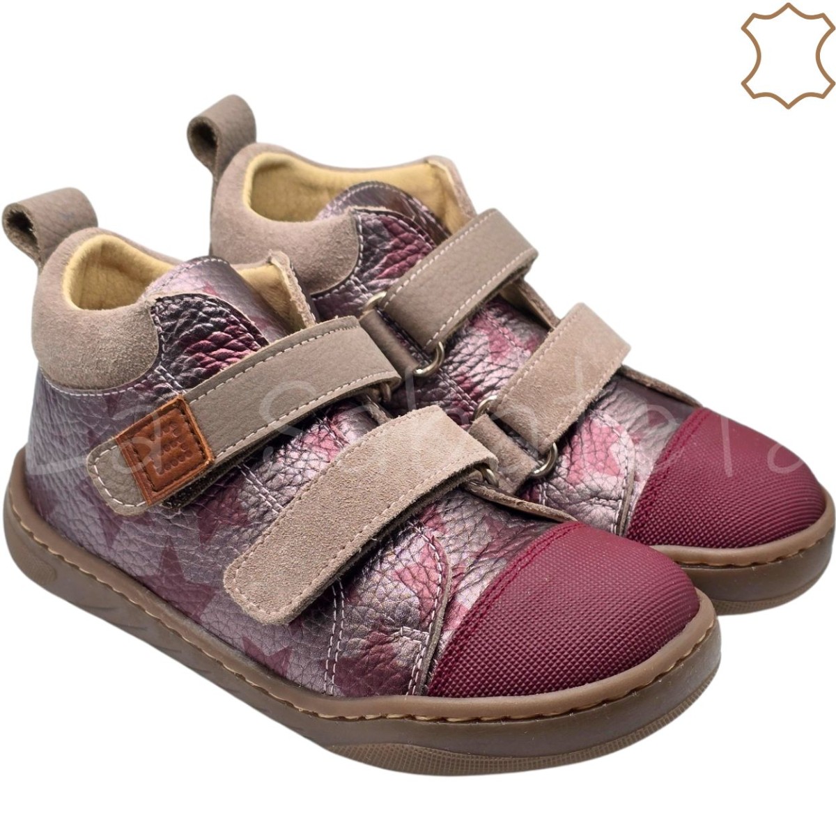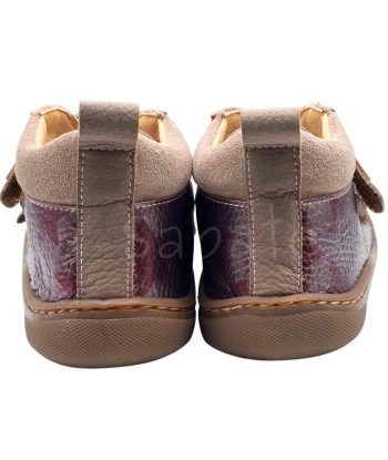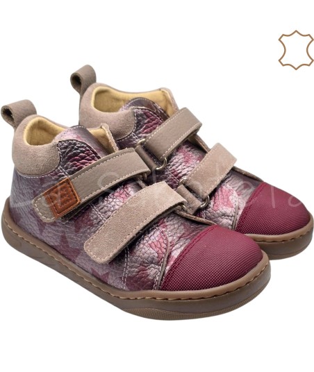 Botin burdeos metalizado con estampado de estrellas compuesto de piel exterior y microfibra interior y con ajuste de velcro. Diseñadas para imitar la pisada como si fueras descalzo, promueve el movimiento del pie y de los dedos de forma natural favoreciendo una postura saludable y un desarollo muscular adecuado desde la infancia hasta la edad adulta. Con puntera reforzada para que tu hijo o hija pueda jugar sin restricciones y ajuste de velcro para favorecer la autonomía.