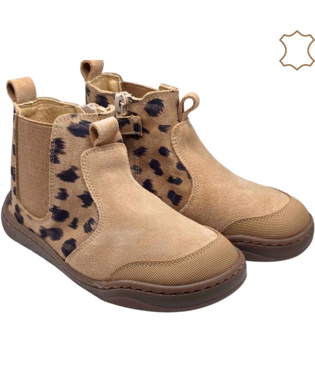 Botin infantil beige en piel con estampado animal print, compuesta de piel exterior y microfibra interior con cremallera lateral. Diseñadas para imitar la pisada como si fueras descalzo, promueve el movimiento del pie y de los dedos de forma natural favoreciendo una postura saludable y un desarollo muscular adecuado desde la infancia hasta la edad adulta. Con puntera reforzada pegada y cosida para que tu hijo o hija pueda jugar sin restricciones y ajuste de velcro y cordón elástico para favorecer la autonomía.