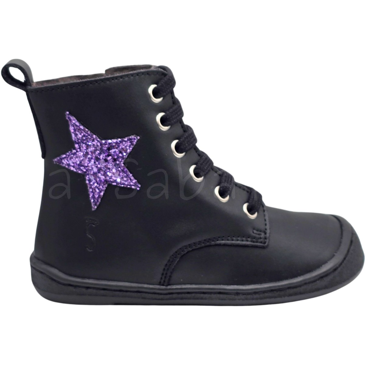 Los Botines en piel de color negro con detalle estrella glitter lila en el lateral están diseñadas para imitar la pisada como si fueras descalzo, promueve el movimiento del pie y de los dedos de forma natural favoreciendo una postura saludable y un desarollo muscular adecuado desde la infancia hasta la edad adulta. Con puntera reforzada cosida y regulación por cremallera lateral interior.