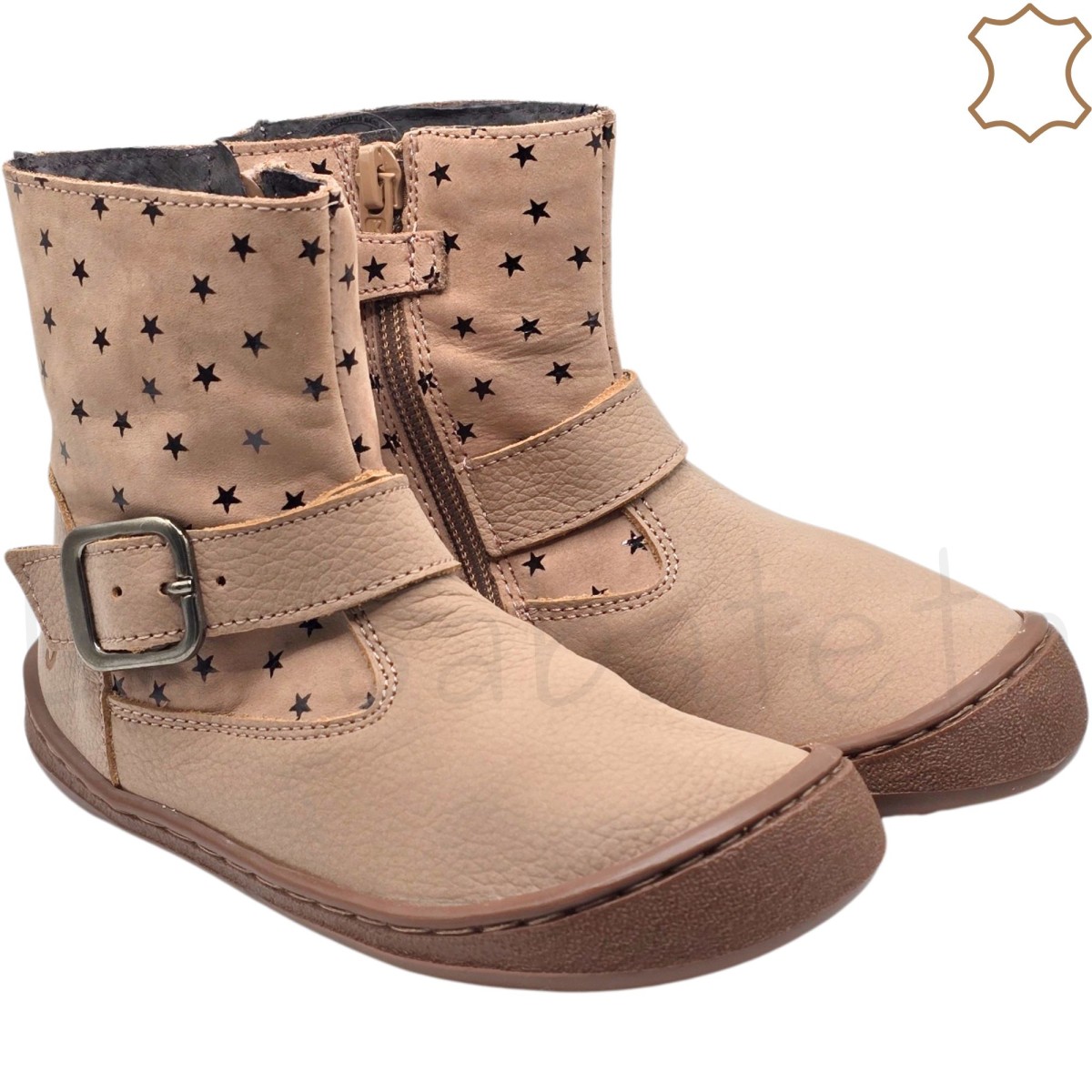 Los Botines en piel de color arena con detalle de estrellitas están diseñados para imitar la pisada como si fueras descalzo, promueve el movimiento del pie y de los dedos de forma natural favoreciendo una postura saludable y un desarollo muscular adecuado desde la infancia hasta la edad adulta. Con puntera reforzada cosida y regulación por cremallera lateral interior.