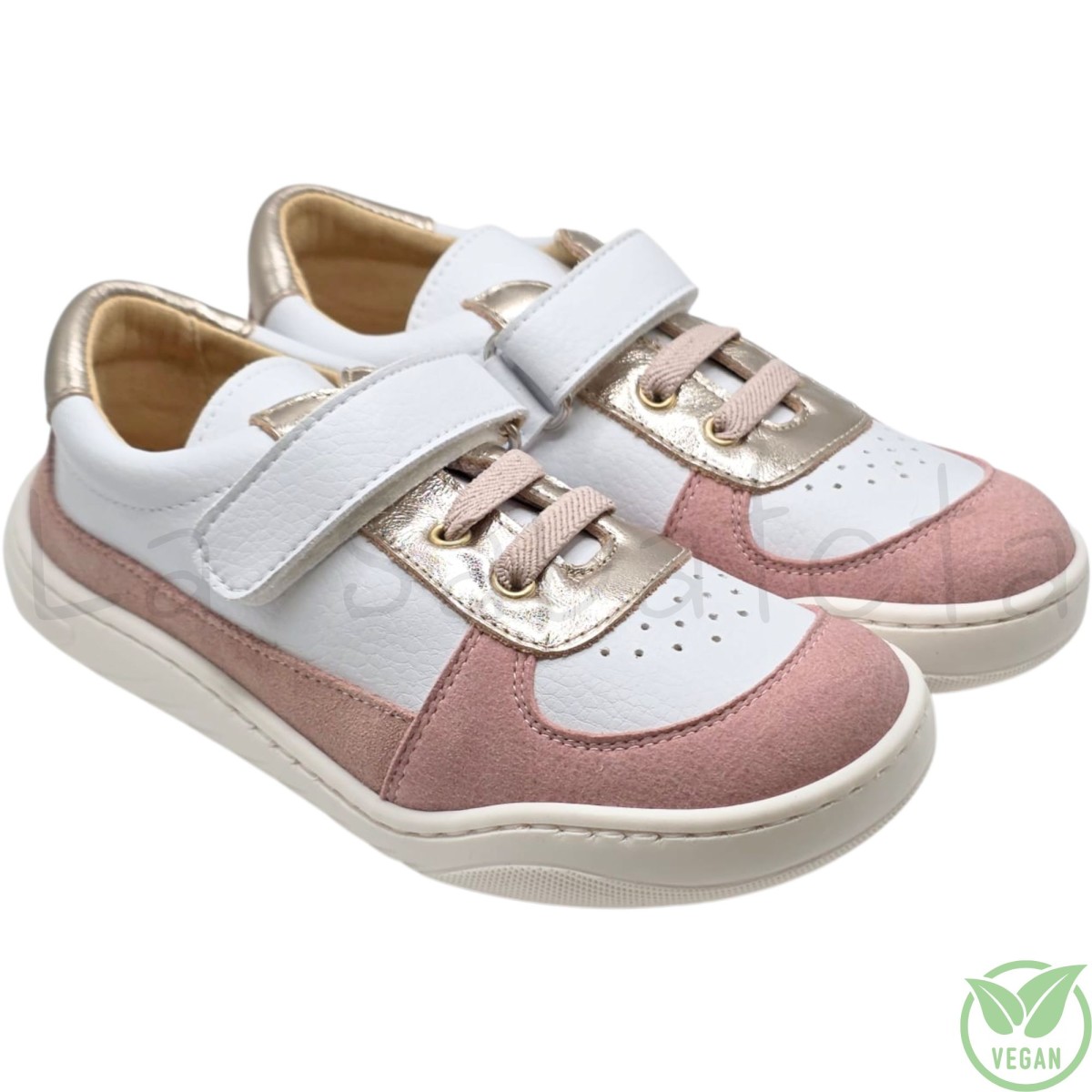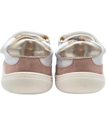 Zapatilla barefoot blanca con detalles en rosa y dorado compuesta de microfibra y piel exterior y microfibra interior y con ajuste de velcro y cordón elástico. Diseñadas para imitar la pisada como si fueras descalzo. Con puntera reforzada en serraje para que tu hijo o hija pueda jugar sin restricciones y ajuste de velcro y cordón elástico para favorecer la autonomía.