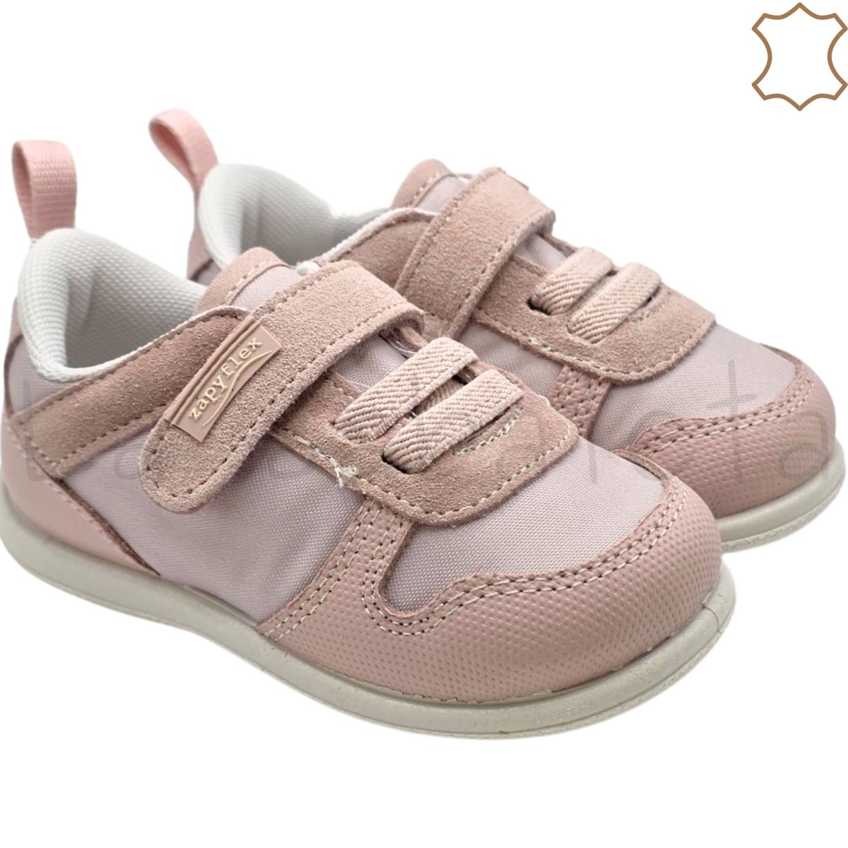 Zapatilla barefoot infantil en textil con detalles en serraje exterior en tono rosa empolvado 🌸Ligera y muy flexible 👣 con suela plana (drop cero) para una pisada natural.