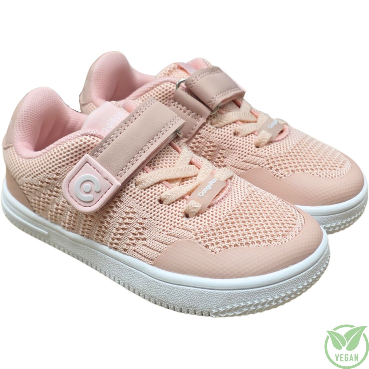 Zapatillas infantiles barefoot de Conguitos en color rosa pastel, diseñadas en rejilla textil transpirable que favorece la ventilación del pie en los meses más activos. Su estructura ligera y flexible permite el movimiento natural, mientras que el cierre combinado de velcro y elástico facilita un ajuste rápido y seguro. Ideales para el día a día, aportan comodidad, autonomía y estilo en cada paso.