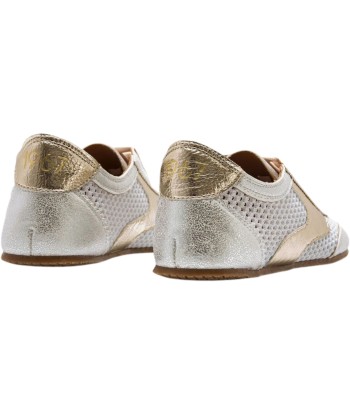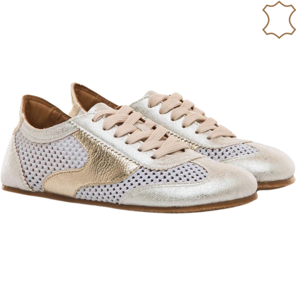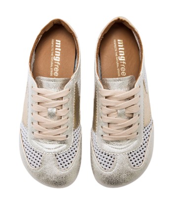 Zapatillas barefoot de color plata de la marca Mustang, modelo Free Mia, de estilo urbano con un toque llamativo. Este modelo de piel con acabado metalizado y detalles brillantes dorados, incorpora paneles laterales de malla tipo rejilla en blanco que aportan textura y contraste. Se trata de un calzado minimalista que gracias a su puntera ancha, suela totalmente plana (cero drop) y flexibilidad, mejora la anatomía del pie y favorece una mejor posición del mismo.