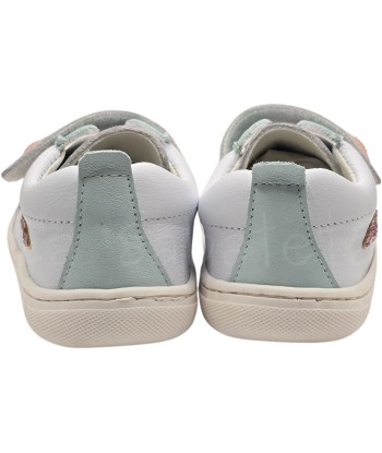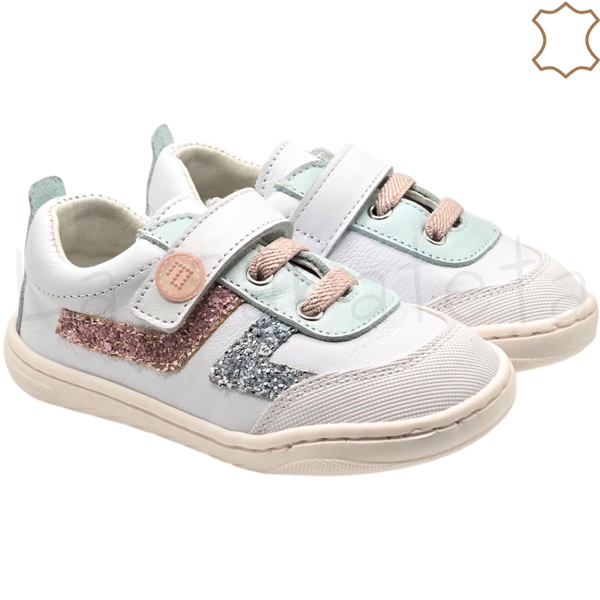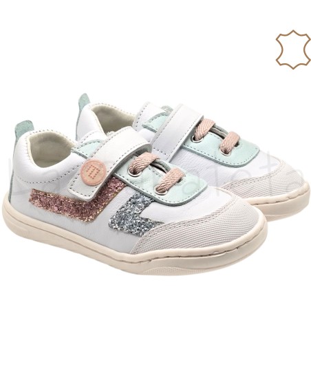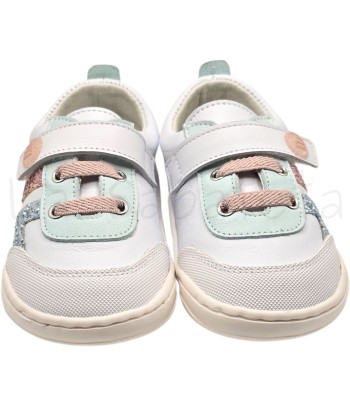 Deportiva blanca con brillo turquesa y rosa lateral compuesta de piel exterior y microfibra interior y con ajuste de velcro y cordón elástico. Diseñadas para imitar la pisada como si fueras descalzo, promueve el movimiento del pie y de los dedos de forma natural favoreciendo una postura saludable y un desarollo muscular adecuado desde la infancia hasta la edad adulta. Con puntera reforzada en serraje para que tu hijo o hija pueda jugar sin restricciones y ajuste de velcro y cordón elástico para favorecer la autonomía.