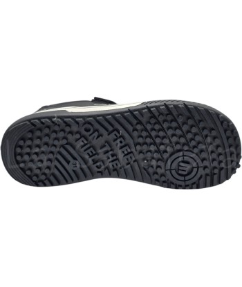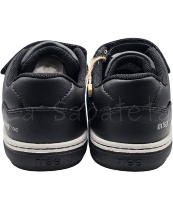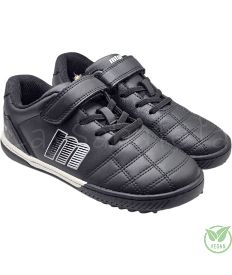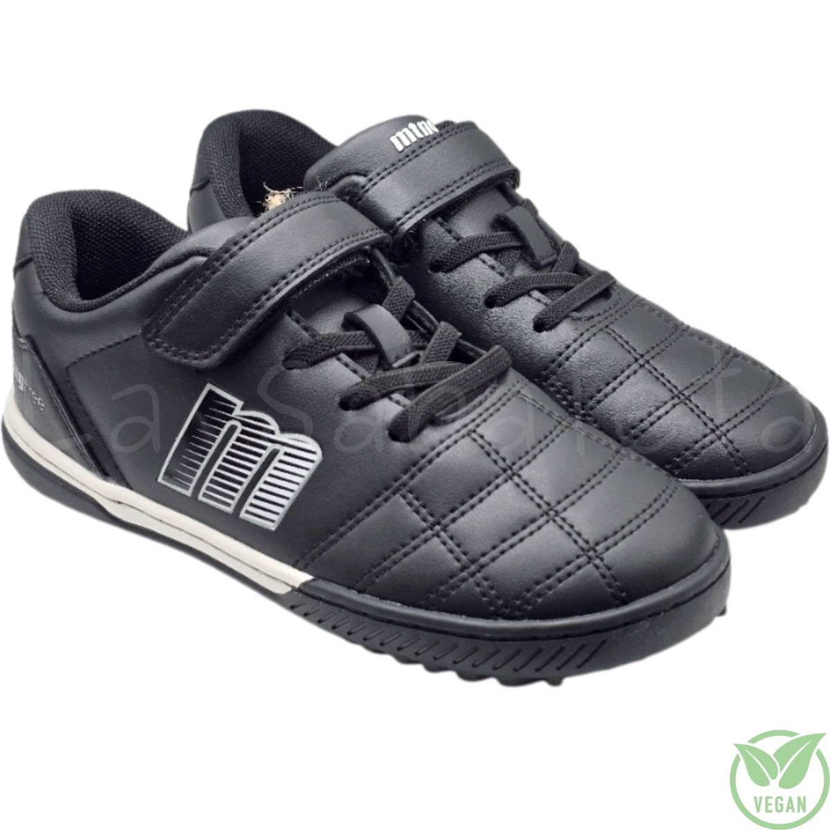 Zapatilla de fútbol barefoot de color negro con detalles blancos de la marca Mustang, modelo Free Play. Diseñada para ofrecer mayor durabilidad en el uso diario, incorpora puntera reforzada que protege el corte de la abrasión por contacto con el suelo. Cierre adhesivo de cosido reforzado que garantiza un ajuste seguro y práctico. La suela de goma incluye pequeños tacos que mejoran la tracción y el agarre. Para césped artificial corto.