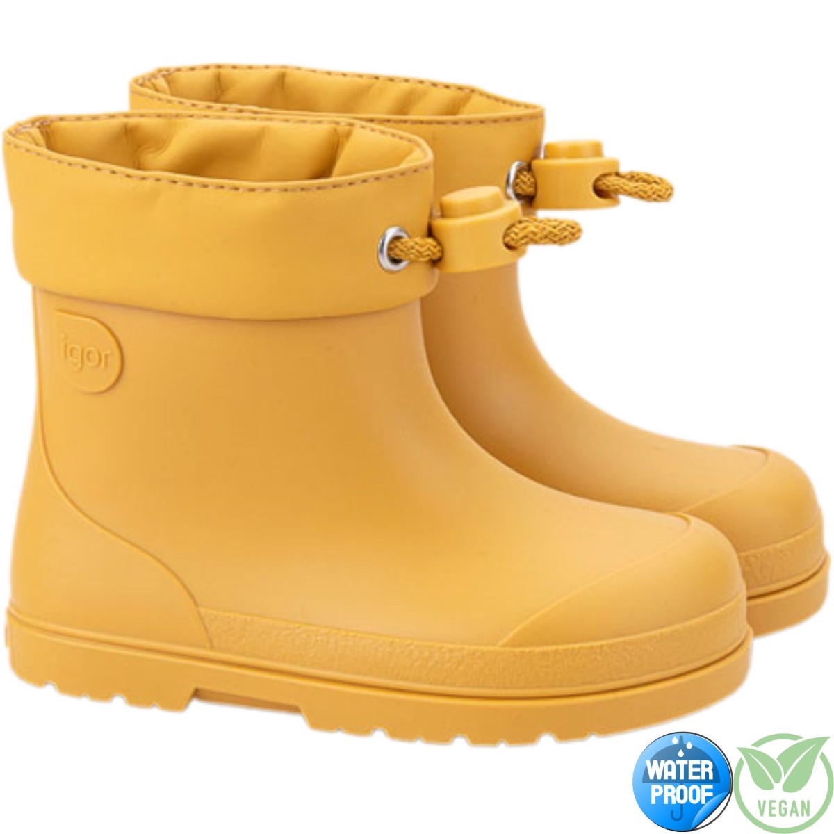 Bota de agua de la marca de calzado respetuoso Igor Barefoot. Acabado mate, cero drop, flexible y blandita. Con plantilla textil extraíble y cuello ajustable para que puedan disfrutar de la lluvia y los charcos al máximo.