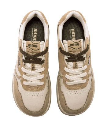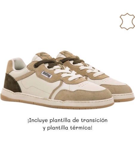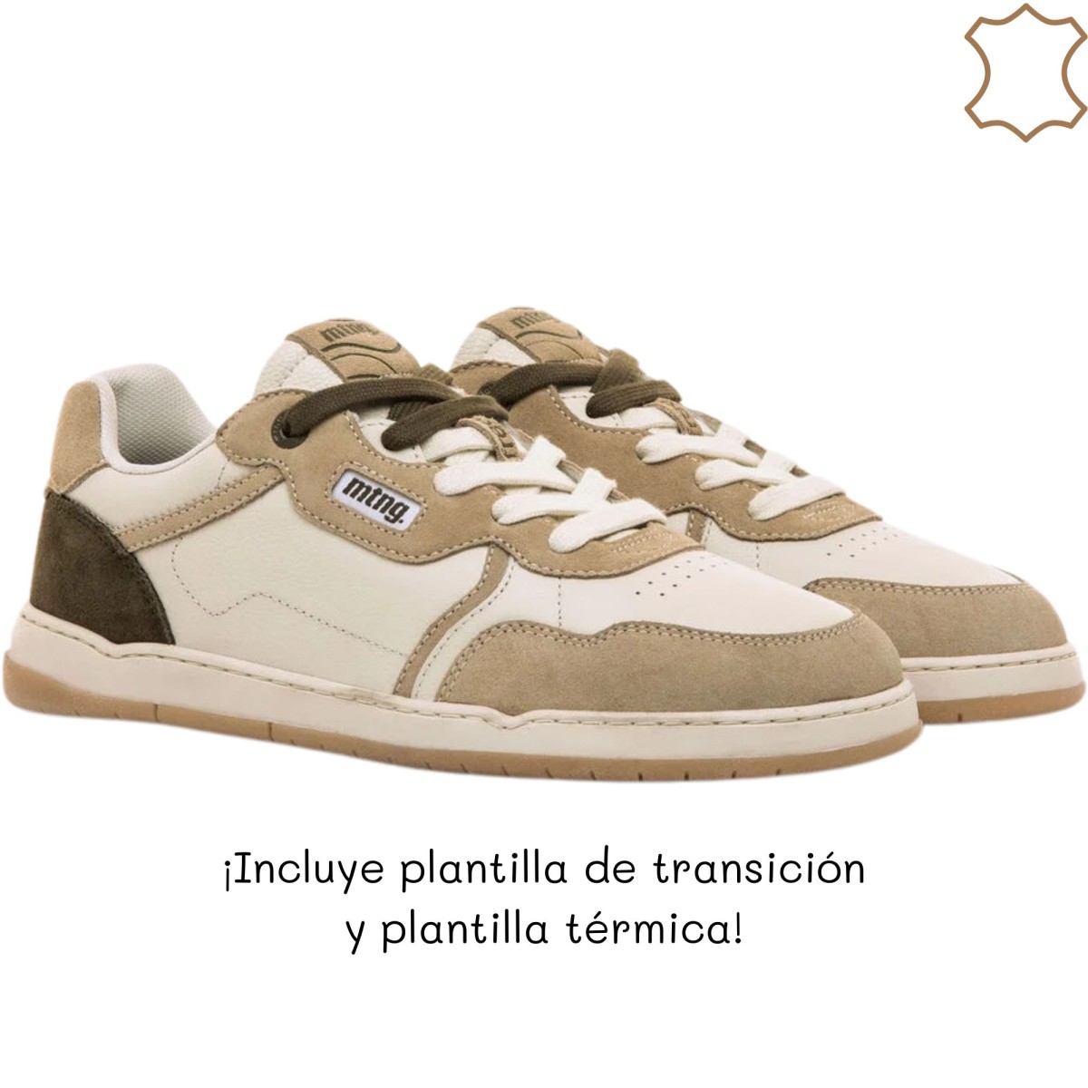 Zapatillas respetuosas de piel de color blanco con detalles beige de la marca Mustang, modelo Free Miami. Su diseño urbano combina paneles con textura y diferentes tonos neutros, aportando un estilo actual y versátil. Se vende con una plantilla de transición para hacer el cambio de calzado convencional a minimalista de manera progresiva. También incluyen plantillas térmicas cero drop, que ayudan a mantener el calor en climas frío, dando el siguiente paso hacia una experiencia aún más respetuosa.
